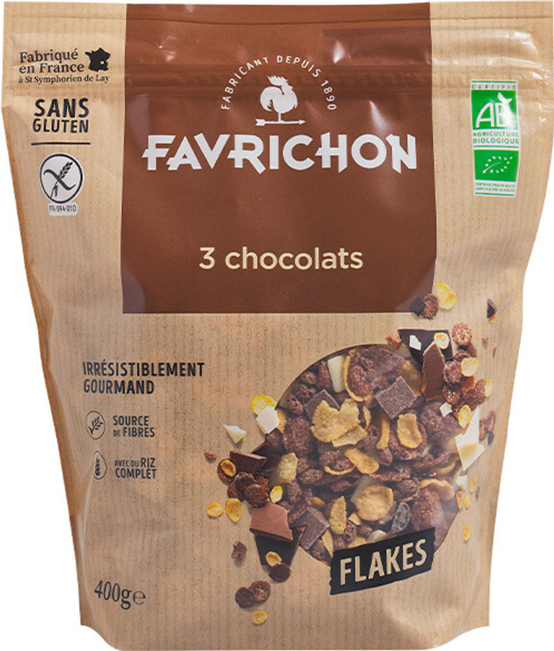 Indulge in a deliciously decadent breakfast with Favrichon's Organic 3 Chocolate Flakes. This premium French cereal is a blend of whole grain rice, corn flakes, and buckwheat flour, invigorated by generous chunks of dark, milk, and white chocolate, all derived from organic farming. The cereal is lightly sweetened with cane sugar, with a hint of sea salt and vanilla to enhance the rich chocolatey goodness. The ingredients include allergens and may also contain traces of nuts. Start your day with a bowlful of this chocolatey delight that's not only delicious but also nourishing.