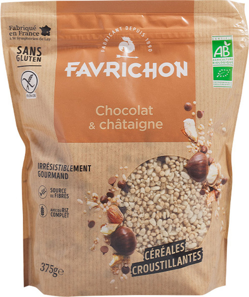 Take your breakfast from ordinary to extraordinary with Favrichon's Organic Chocolate and Chestnut Cereals. Crafted from the finest organic ingredients, this delectable cereal is a wholesome and tasty start to your day. High-quality brown rice forms the base, complemented by the delightful sweetness of chestnut cream and flour. To top it all off, the organic chocolate chips provide a decadent touch that makes this cereal a real treat. And with the subtle hint of cane sugar and vanilla extract, you might just forget you're eating breakfast and not dessert!