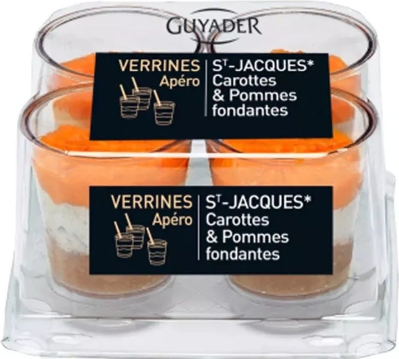 Guyader's Scallop Carrots and Melting Apples Verrines are ready-to-serve, making them the perfect addition to your aperitif cocktail or apernoel party. Simply open the package and serve these delightful verrines on a platter. They make an excellent finger food that pairs well with a glass of champagne or white wine.
