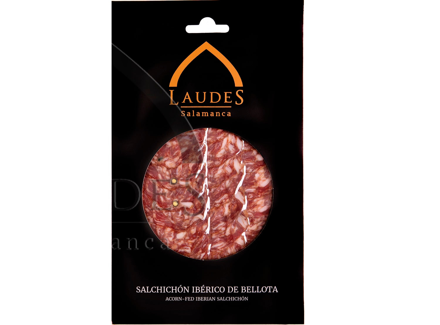 Introducing the Laudes Sliced Iberian Acorn-Fed Sausage - a gastronomic delight from the heart of Spain. This Salchichón Ibérico de Bellota, perfectly sliced and ready to eat, offers a unique flavor profile that elevates any meal. Fed exclusively on acorns, the Iberian pigs produce a meat that’s both rich and delicately flavored, with a wonderful balance of savory and sweet notes. The Laudes brand is renowned for their commitment to quality and tradition, ensuring every slice of this sausage encapsulates the true essence of Spanish cuisine.