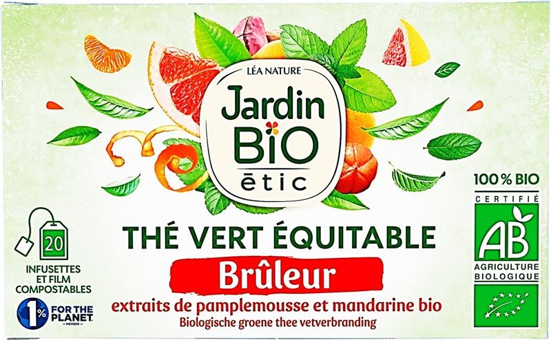 Experience the refreshing and rejuvenating benefits of the Organic Green Tea Fat Burner from Jardin Bio. This carefully formulated wellness blend combines the antioxidant properties of 50% green tea with the invigorating essences of honeybush, peppermint, and mandarin extract. Enhanced with natural fat-burning elements such as guarana, mate, green coffee, and grapefruit extract, this delicious tea supports healthy weight management. Jardin Bio is committed to fair trade, with 72% of the agricultural ingredients adhering to equitable commerce standards.