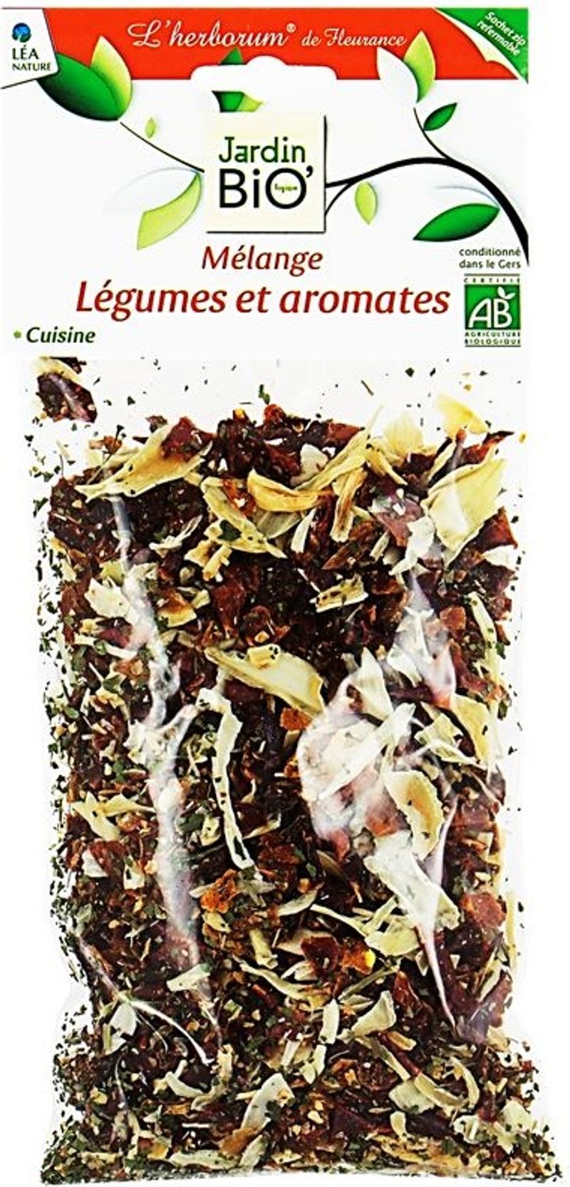 Introducing the Jardin Bio's Organic Vegetables and Herbs Mix, a blend of 57% dried vegetables and 43% aromatic herbs. This mix is a unique combination of peppers, tomatoes, onions, garlic, parsley, chives, chervil, and tarragon, all organically grown. This mix is not only tasty but also offers the health benefits that come with consuming organic produce. The peppery taste of the peppers is balanced by the sweetness of the tomatoes, while the aromatic herbs enhance the overall flavor, making your meals delicious as well as nutritious.