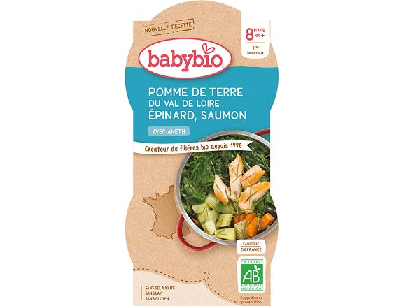 Nourish your little one with the delightful essence of French cuisine with Babybio's Organic Loire Valley Potatoes, Spinach and Salmon for Babies. Sourced from the finest organic farms in France, this wholesome baby food comprises 27% Loire Valley potatoes, 15% Holland spinach, 8.5% North Atlantic salmon, Spanish onions, Camargue PGI rice, Sicilian lemon juice, and a touch of French dill. Accentuated with vegetable oils and Spanish onions, each spoonful offers a balanced blend of vital nutrients essential for your baby's growth and development. Free from gluten and suitable for babies aged 8 months and above, this product adheres to Babybio's commitment to encourage healthy eating habits right from the start.