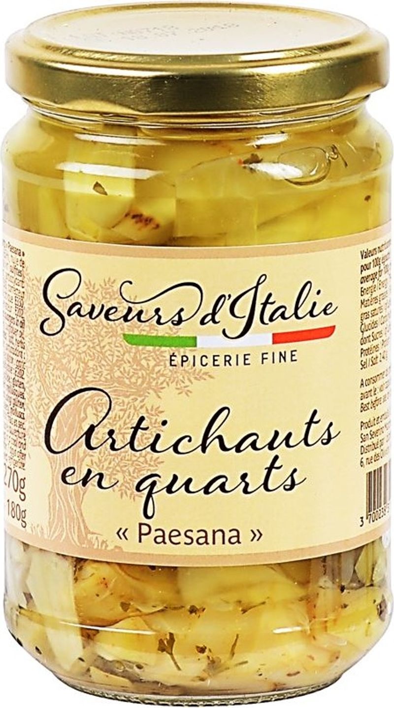 Indulge in the rich taste of Italy with Saveurs D’Italie's Artichokes in Olive Oil. This premium jarred antipasti represents a sublime blend of tender artichokes, sunflower oil, garlic, wine vinegar, and a hint of chilli pepper, oregano, and parsley that will instantly elevate your appetizer game. Each ingredient is carefully sourced and combined, ensuring that every bite is bursting with authentic Italian flavors. Made with 65% artichokes, this preserve is a great source of vitamins and antioxidants. Perfect for health-conscious individuals with a palate for gourmet food.