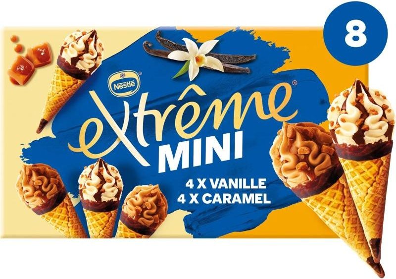 Get ready to experience the ultimate delight with NESTLE's Caramel and Vanilla Ice Cream Cones. Crafted with the finest ingredients, these cones are a delectable blend of creamy caramel and velvety vanilla ice cream, enveloped in a crispy wafer cone and adorned with a scrumptious tip of EXTREME candy. The caramel variant is a fusion of caramel ice cream with a soulful salted butter caramel sauce and chunks that add a distinctive taste. Meanwhile, the vanilla variant is a combo of vanilla ice cream with a luscious cocoa filling and crunchy nougatine chips that elevate the flavor profile. Being a part of the FROZEN category, these NESTLE ice cream cones offer a refreshing and delightful way to beat the heat.